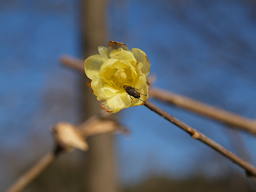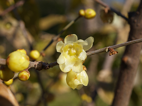 早春にいち早く咲く樹木のひとつ。よくみかけるソシンロウバイよりも花は一回り小さく中はやや茶色がかることで見分けられる。香りも良く人気のある樹木だ。(写真:国内)