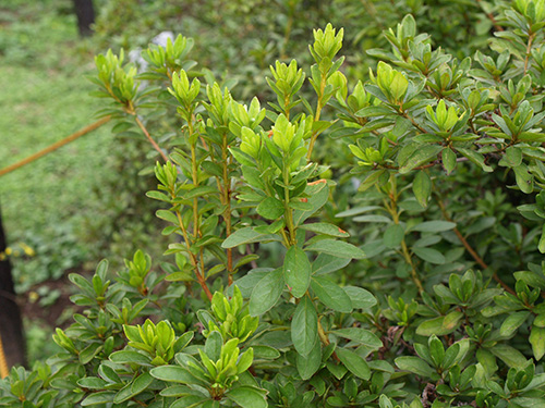 山地に自生するツツジ。春に淡いピンクの花を一斉に咲かせる。数品種が知られ庭木として使われている。若い芽や蕾などがべたべたする。(写真:国内)